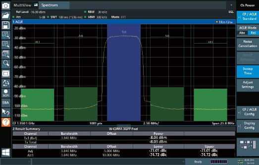 邻道泄漏比 (ACLR) 测量需要高动态范围,可使用信号与频谱分析仪执行