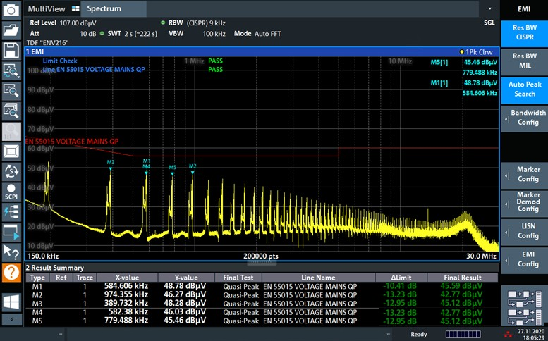 电磁干扰 (EMI) 方面同样需要确保一致性。相应的EMI标准要求使用适当的 EMI 检测器 (准峰值、CISPR-Average和MS-Average (CISPR-RMS)) 测量最低数量的杂散。信号与频谱分析仪可进行对应的预一致性测量。