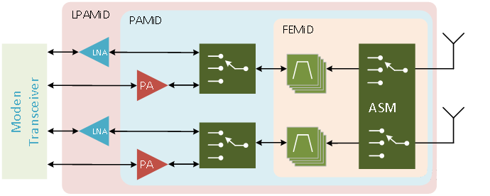 迅速增加的频段和射频器件数量为智能手机带来了挑战,除了复杂度的提升以外,对射频器件占用空间的逐步压缩和载波聚合的应用,使得传统的分离式射频器件越来越难以满足新的需求,射频器件模组化已成行业发展趋势。依据不同需求,射频前端模组的构成也有所差别,下图为几种典型的原理框图。其中开关的控制接口是标准化的MIPI 接口。