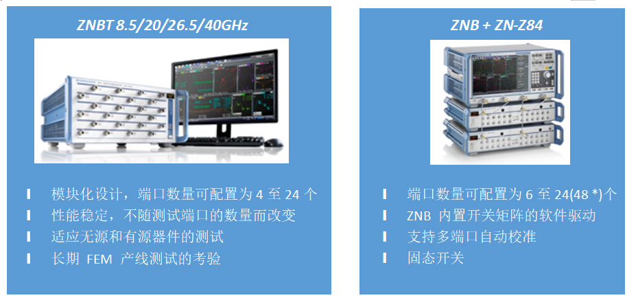 图4 R&S ZNBT以及R&S ZNB + ZN-Z84是两款专门针对射频前端多端口器件的测试方案