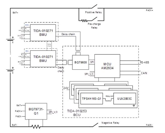 图 1 展示了一个电池储能系统的架构。德州仪器适用于储能系统的可堆叠电池管理单元参考设计描述了一个通过使用 BQ79616 集成的冗余电池信息检测来监测系统问题的可堆叠电池管理单元 (BMU),而适用于储能系统的电池控制单元参考设计展示了一个通过可靠的开关驱动设计确保系统安全的电池控制单元 (BCU)。
