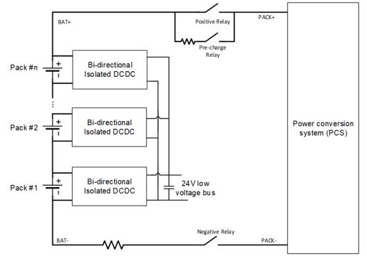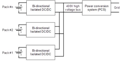 图 4 说明了在不同电池包之间均衡能量的另一种选择:使用低压总线而不是高压总线来中继能量以保证系统高效率。隔离式直流/直流转换器位于电池包和低压总线之间,仅在电池包需要均衡时才会工作。由于均衡能量只在不同的电池包之间流动,隔离式直流/直流转换器的额定功率较小,为了保持低压母线电压稳定,必须确保输送到低压总线上的能量和从低压总线上抽取的能量维持动态均衡。