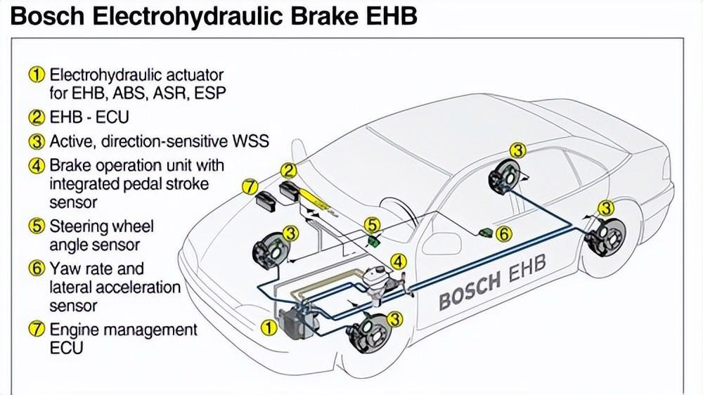 EHB(Electro-Hydraulic Brake)即线控液压制动器,是在传统的液压制动器基础上发展而来的。EHB用一个综合的制动模块来取代传统制动器中的压力调节器和ABS模块等,这个综合制动模块就包含了电机、泵、蓄电池等等部件,它可以产生并储存制动压力,并可分别对4个轮胎的制动力矩进行单独调节。比传统的液压制动器,EHB有了显著的进步,其结构紧凑、改善了制动效能、控制方便可靠制动噪声显著减小、不需要真空装置、有效减轻了制动踏板的打脚、提供了更好的踏板感觉。由于模块化程度的提高,在车辆设计过程中又提高了设计的灵活性、减少了制动系统的零部件数量、节省了车内制动系统的布置、空间。可见相比传统的液压制动器,EHB有了很大的改善。但是EHB还是有其局限性,那就是整个系统仍然需要液压部件,其基本的还是离不开制动液。