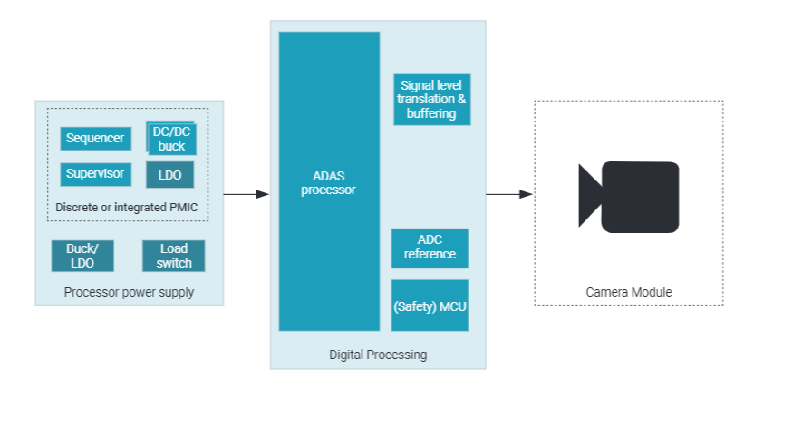 为了执行视觉预处理、深度和运动加速或 AI 网络处理等处理任务以支持 ADAS 功能,系统中的片上系统 (SoC) 需要高效的电源。在设计 ADAS 前置摄像头时,面临以下四大电源挑战。