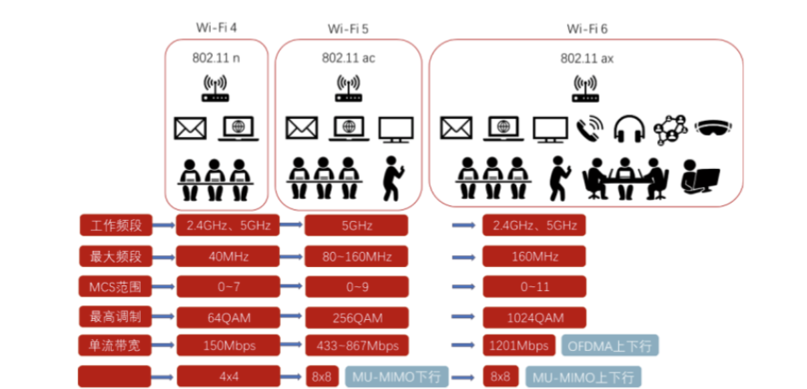 WiFi的发展始终专注于速度和范围这两个关键技术。WiFi6引入了OFDMA和MU-MIMO等技术,并发用户数是上一代的4倍,且时延更低、功耗更低。