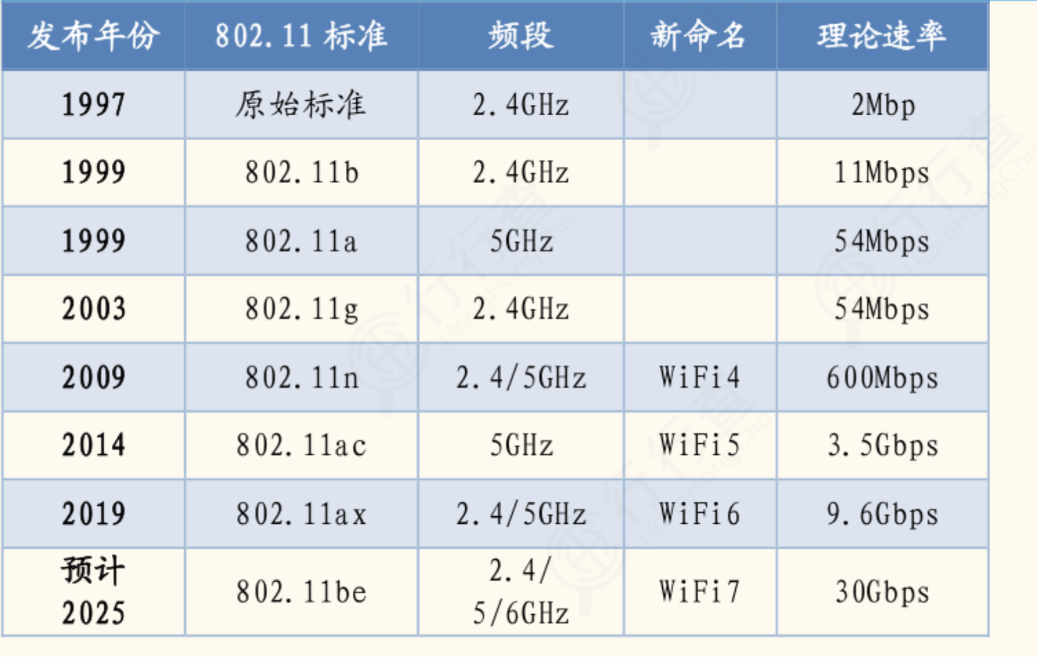 WiFi 7预计将在2025年现身,其目标是部署在2.4/5/6Ghz 频段,传输速率可达到30Gbps。