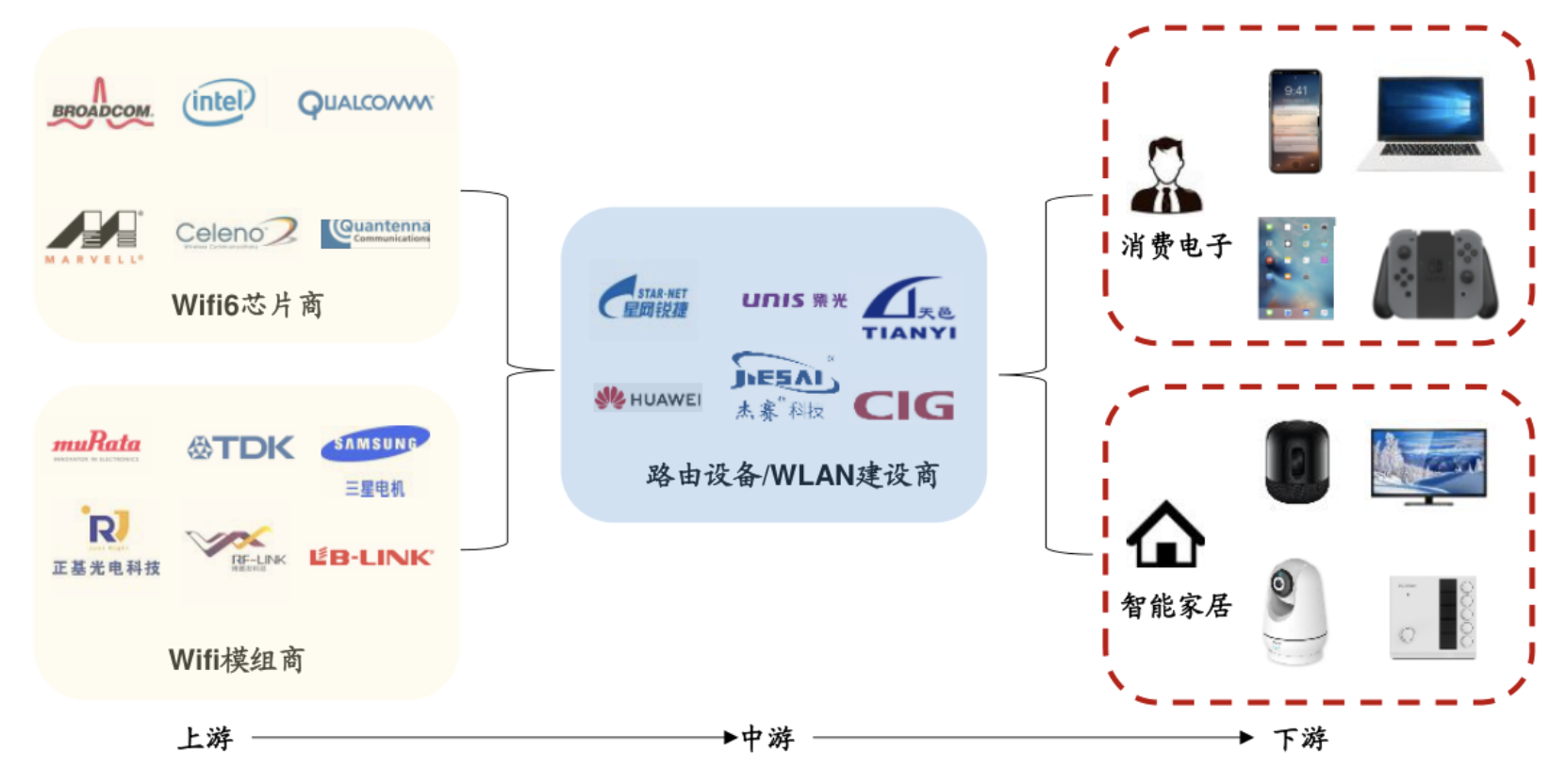 下游主要是系统集成的智能应用服务和支持WiFi6的手机等终端设备。