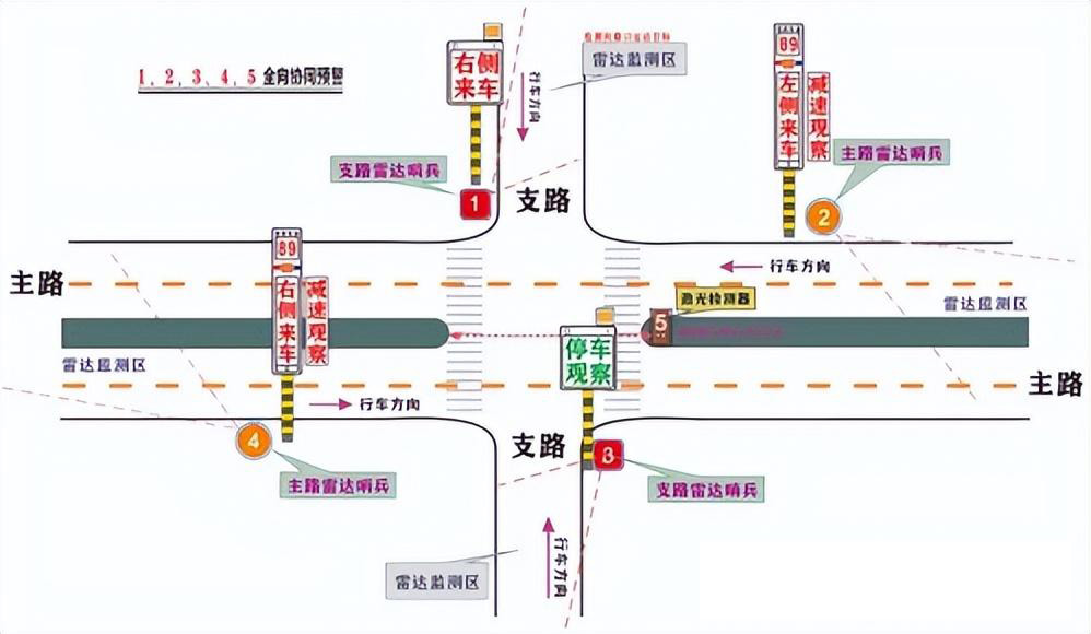 高速合流匝道雷达预警检测技术应用控制逻辑:当支路车辆行至高速汇入口,距离支路哨兵80~100米处,此时,当高速主路有车驶近汇入点【1号哨兵检测到车辆接近汇入点,自动无线发送数据给2号哨兵】,2号支路哨兵会向支路车辆发出红色警示信息:“左侧来车,注意避让”并启动红蓝爆闪灯,同时对匝道合流车辆进行测速警示。