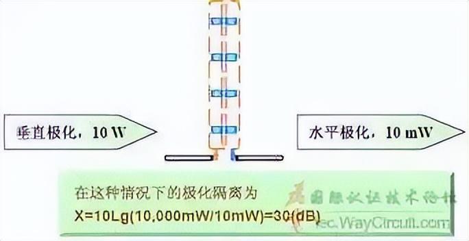 极化完全隔离:当接收天线的极化方向与来波的极化方向完全正交时,例如用水平极化的接收天线接收垂直极化的来波,或用右旋圆极化的接收天线接收左旋圆极化的来波时,天线就完全接收不到来波的能量,这种情况下极化损失为最大,称极化完全隔离。理想的极化完全隔离是没有的。馈送到一种极化的天线中去的信号多少总会有那么一点点在另外一种极化的天线中出现。例如下图所示的双极化天线中,设输入垂直极化天线的功率为10W,结果在水平极化天线的输出端测得的输出功率为10mW。