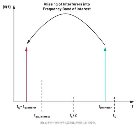 对连续信号进行采样和数字化处理会导致信息丢失,这称为量化噪声。采样频率和位数决定了ADC架构的性能限制。解决基准电压源和输入的性能和接口挑战之后,下一个难题是解决高频(HF)干扰源/噪声折叠到目标低频带宽的问题。这称为混叠或折回。这些进入目标带宽的高频或带外干扰源的反射图像导致信噪比(SNR)降低。根据采样准则,采样频率周围的任何信号音都会在带内折回,如图6所示,在目标频带内产生不必要的信息或错误。有关混叠的更多详细信息参见教程MT-002: 奈奎斯特准则对数据采样系统设计有何意义。