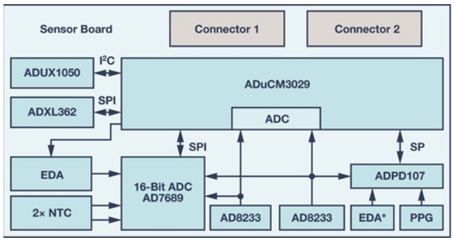 设备中集成了超低功耗ADuCM3029 以收集传感器数据并运行算法。图2展示了传感器板上集成的器件。