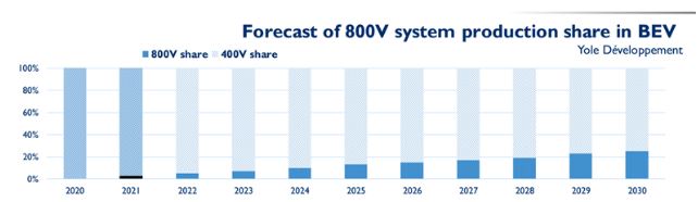 2020-2030 年的 800V 系统生产份额增长情况条形图。数据来源:yole 公司的市场调研结果