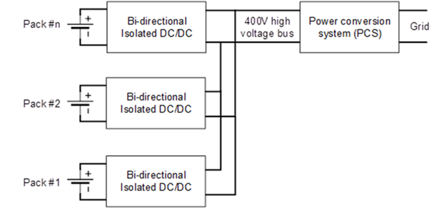 图 4 说明了在不同电池包之间均衡能量的另一种选择:使用低压总线而不是高压总线来中继能量以保证系统高效率。隔离式直流/直流转换器位于电池包和低压总线之间,仅在电池包需要均衡时才会工作。由于均衡能量只在不同的电池包之间流动,隔离式直流/直流转换器的额定功率较小,为了保持低压母线电压稳定,必须确保输送到低压总线上的能量和从低压总线上抽取的能量维持动态平衡。