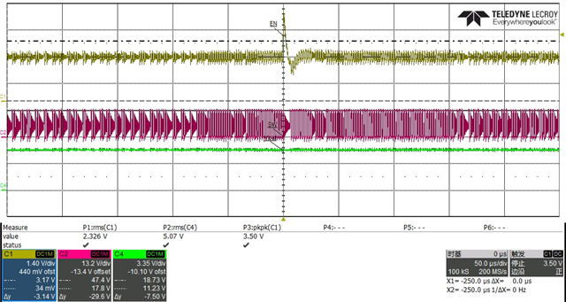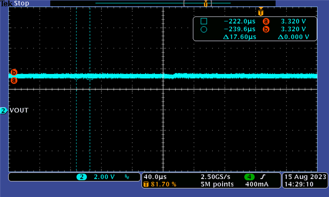 对此,如果需要在我们的EVM板上用热电偶测试温度,将R4/R5降低到51k/10.5k欧姆,同时添加一个1nF的X7R电容与R5并联。测试之后表现出后端MCU不会再复位。研发工程师把输出电压改成3.3V,测得的波形如下。可以看出,输出电压Vout稳定在3.3V,不会对后端MCU造成影响。