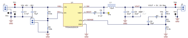 通过观察抓取的波形图,推测是热电偶布在54202的塑壳上给EN脚引入电机噪声。于是检查TPS54202的原理图和layout,R4和R5设置得比较大是因为可以提高整体效率。因为高电阻将减少电阻的功率损失,如果不使用热电偶进行测试(热电偶容易引入噪声),那么这些大电阻比较合适;关于EN脚的受干扰程度,是因为大电阻所产生的信号比较小,所以更容易被噪声淹没,这就代表信噪比不高。要提高信噪比,就要加强信号,或者减弱噪声。减小电阻就可以加强信号,并联电容就可以减少噪声。