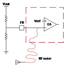 通过观察图四可以发现,TPS54202的FB引脚的电压由于持续性的巨大的射频能量而被拉到0,从而导致芯片内部不断发脉冲,让输出电压升高。分析FB引脚的特性和图二的EVM板的原理图和,FB引脚的内部结构是一个接收器,它很容易受到具有大量能量的耦合噪声的干扰,图二的C8也就是Cff(前馈电容), Cff作为低阻抗路径,能将一对零极点引入回路,带宽将会增加,带宽增加容易引入更多的噪声(如图五)。