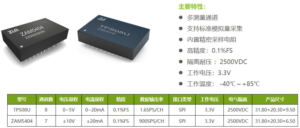 ZAM5404 是一款带有电气隔离功能的高精度模拟量采集模块,集16 位ADC、信号调理电路、信号隔离和电源隔离于一体,可以实现高精度的电流和电压采集,可用于±20mA/±10V 工业标准的传感器输出信号采集具有8 个采集通道,包括4 个电流采集通道和4 个电压采集通道。