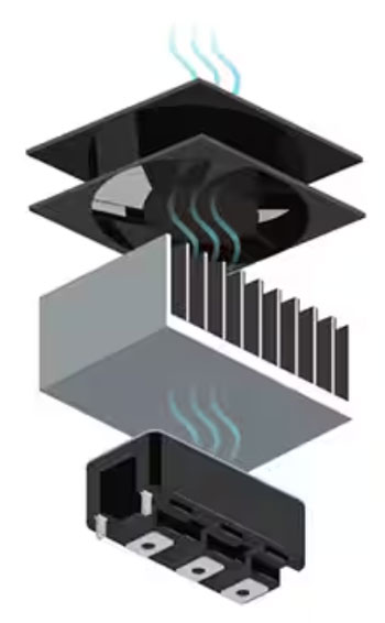 最有效的热管理方法是将散热器和强制通风相结合。IGBT 等半导体器件的内部热阻通常极低,而该器件与周围空气之间的热阻则相对较高。安装散热器可大幅增加向环境空气散热的可用表面积,从而降低热阻。此外,在散热器上引导气流可进一步提高其能效。鉴于器件空气界面是系统中最重要的热阻,因此将其最小化至关重要。这种直接方法的优势在于无源散热器的可靠性和风扇技术的成熟性。